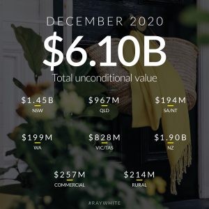 In our final chapter of 2020, we wrote a total of $6.1 billion in unconditional sales in December, up a staggering 60.7 per cent on the year prior. In Australia alone, we recorded almost $4 billion in sales, up 50 per cent, with a record result in Victoria to cap off an incredible recovery given extended lockdowns across that state. New Zealand recorded its sixth consecutive record month, with $1.9 billion in sales which was 87 per cent higher than last year.