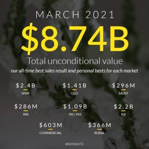 Record results were recorded in every market, including in Western Australia which saw $286 million in sales, beating our previous record set in 2007. Across Australia, we recorded $6.4 billion in total unconditional sales, up 90 per cent on the prior March. In New Zealand, we transacted $2.2 billion of property, up 99 per cent.